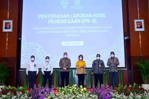 Hal tersebut disampaikan pada penyerahan Laporan Hasil Pemeriksaan (LHP) atas LK Kemenkeu BA 015 dan LHP LK BUN Tahun 2021 kepada Menteri Keuangan (Menkeu), Sri Mulyani, di kantor Kemenkeu, Jakarta, Rabu (29/6). Acara tersebut dihadiri oleh para pejabat struktural dan fungsional di lingkungan BPK dan Kemenkeu.