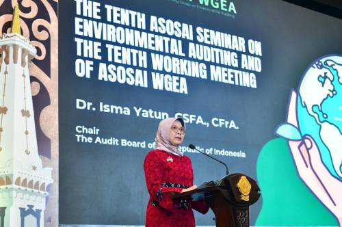 YOGYAKARTA, Humas BPK – Ketua Badan Pemeriksa Republik Indonesia (BPK RI), Isma Yatun membuka secara langsung kegiatan internasional bertajuk 10th ASOSAI Seminar on Environmental Auditing dan 10th Working Meeting of ASOSAI pada Senin (24/2) di Yogyakarta. Kegiatan ini merupakan kolaborasi antara BPK RI dengan SAI Cina (China National Audit Office/CNAO) sebagai Ketua dan Sekretariat ASOSAI Working Group on Environmental Audit (WGEA).