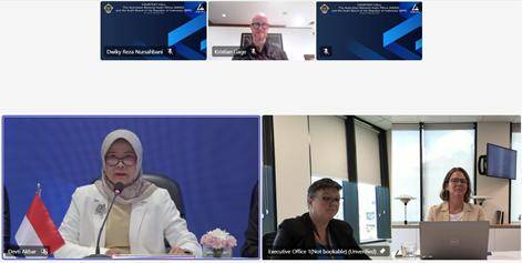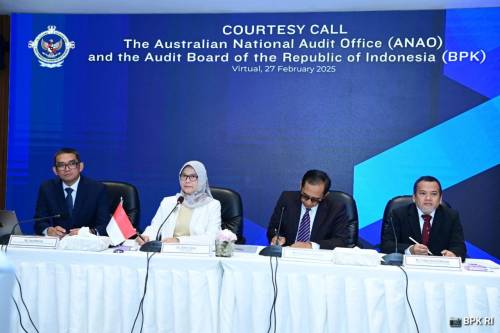 JAKARTA, Humas BPK – Ketua Badan Pemeriksa Keuangan Republik Indonesia (BPK) Isma Yatun dan Auditor-General (AG) Australia Caralee McLiesh mengadakan virtual courtesy call pada Kamis (27/2). Pertemuan ini bertujuan untuk memperkuat hubungan bilateral BPK dengan Australian National Audit Office (ANAO) dan membahas langkah-langkah strategis dalam mendukung peningkatan audit sektor publik. Hadir dalam pertemuan tersebut Kepala Badan Pendidikan dan Pelatihan Pemeriksaan Keuangan Negara R. Yudi Ramdan Budiman, Kepala Biro Teknologi Informasi Pingky Dezar Zulkarnain, dan Kepala Biro Humas dan Kerja Sama Internasional Teguh Widodo. Dari ANAO Chief Operating Officer Jacquie Walton, dan Senior Advisor Kristian Gage.