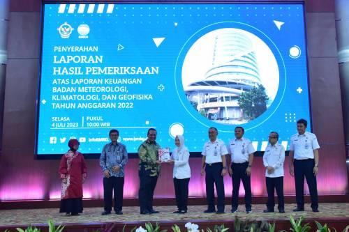 JAKARTA, Humas BPK – Berdasarkan hasil pemeriksaan yang telah dilakukan, Badan Pemeriksa Keuangan (BPK) tidak menemukan permasalahan signifikan yang berdampak kepada kewajaran penyajian laporan keuangan (LK). Atas hal tersebut, BPK memberikan opini atas LK Badan Meteorologi, Klimatologi, dan Geofisika (BMKG) tahun anggaran 2022 dengan predikat Wajar Tanpa Pengecualian (WTP).