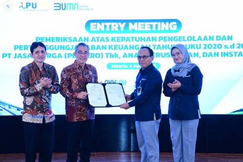JAKARTA, Humas BPK – Anggota VII Badan Pemeriksa Keuangan (BPK)/Pimpinan Pemeriksaan Keuangan Negara VII, Hendra Susanto, memimpin entry meeting pemeriksaan atas kepatuhan pengelolaan dan pertanggungjawaban keuangan tahun buku 2020 – 2022, pada PT Jasa Marga (Persero) Tbk., anak perusahaan, dan instansi terkait, yang dilaksanakan di kantor pusat PT Jasa Marga (Persero) Tbk., Jakarta, Selasa (4/4).