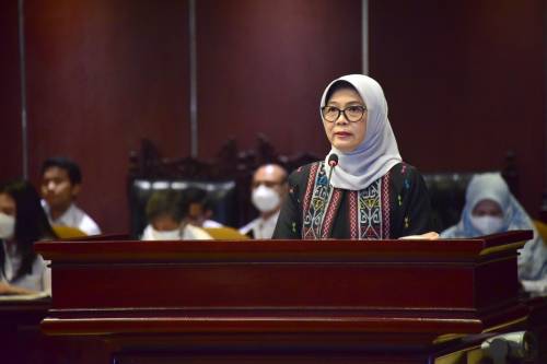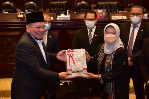 Jakarta, Humas BPK – Ketua Badan Pemeriksa Keuangan (BPK), Isma Yatun, menyerahkan Laporan Hasil Pemeriksaan (LHP) atas Laporan Keuangan Pemerintah Pusat (LKPP) Tahun 2021 kepada Ketua Dewan Perwakilan Daerah (DPD), AA La Nyaalla Mahmud Mattalitti, pada sidang paripurna di Kantor DPD Jakarta, Rabu (15/6).