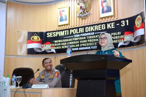 BANDUNG, Humas BPK – Ketua Badan Pemeriksa Keuangan (BPK), Isma Yatun, memberikan ceramah dengan mengangkat tema “Akuntabilitas Pengelolaan dan Pemeriksaan Keuangan Negara”, kepada para peserta Sekolah Staf dan Pimpinan Tingkat Tinggi (Sespimti) Kepolisian Republik Indonesia (Polri), pada Jumat (24/06), di Bandung, Jawa Barat.