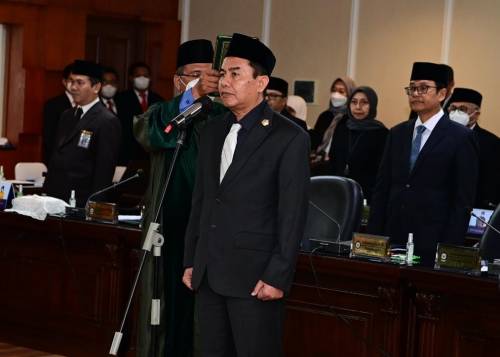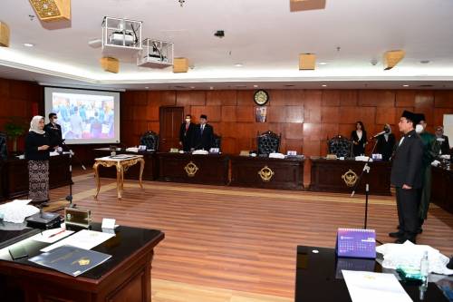 JAKARTA, Humas BPK – Ketua Badan Pemeriksa Keuangan (BPK), Isma Yatun, memandu pengambilan sumpah Anggota Majelis Kehormatan Kode Etik (MKKE) BPK dari unsur profesi di kantor pusat BPK, di Jakarta, Senin (17/4).