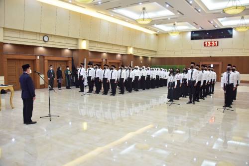 JAKARTA, Humas BPK – Sekretaris Jenderal Badan Pemeriksa Keuangan (Sekjen BPK), Bahtiar Arif, memimpin pengambilan sumpah/janji pengangkatan Pegawai Negeri Sipil (PNS). Pengambilan sumpah/janji formasi sekolah kedinasan Politeknik Keuangan Negara STAN tahun 2021 di lingkungan BPK itu berlangsung secara hybrid di auditorium BPK Pusat dan BPK Perwakilan, Senin (19/12).
