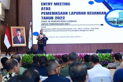 JAKARTA, Humas BPK – Sebanyak 20 kementerian dan lembaga yang merupakan entitas pemeriksaan di lingkungan Auditorat Utama Keuangan Negara I (AKN I) Badan Pemeriksa Keuangan (BPK), menghadiri entry meeting pemeriksaan atas laporan keuangan tahun 2022 di kantor pusat BPK, di Jakarta, Kamis (26/1).