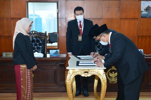 JAKARTA, Humas BPK – Ketua Badan Pemeriksa Keuangan (BPK), Isma Yatun, memandu pengambilan sumpah 2 (dua) Anggota Majelis Kehormatan Kode Etik (MKKE) BPK dari Unsur BPK di Kantor Pusat BPK, pada Rabu (18/05).