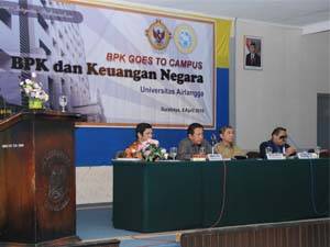 Jakarta, Kamis (8 April 2010) – BPK RI mengadakan acara Goes To Campus dengan tema “BPK dan Keuangan Negara” di Universitas Airlangga (UNAIR) Surabaya dan ekshibisi ke-BPK-an. Acara ini merupakan bagian dari rangkaian kegiatan public awareness BPK RI di kalangan akademisi dan media. Bertindak sebagai narasumber pada kegiatan ini adalah Ketua BPK RI, Drs. Hadi Poernomo, Ak., Anggota I BPK RI, Drs. Moermahadi Soerja Djanegara dan Inspektur Utama BPK RI, Nizam Burhanuddin, SH., MH. Turut hadir dalam acara tersebut adalah Rektor Unair, Prof. Dr. Fasich, apt., Kepala Perwakilan Provinsi Jawa Timur, Mahendro Sumardjo, mantan Kepala Perwakilan Provinsi Jawa Timur, Zindar Kar Marbun, Plt. Kepala Biro Humas dan Luar Negeri BPK RI, Gudono serta beberapa pejabat struktural di lingkungan BPK Pusat maupun BPK Perwakilan Provinsi Jawa Timur.