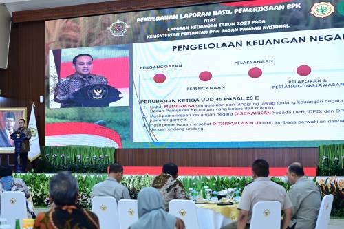 Dalam sambutannya, Anggota IV BPK menyampaikan bahwa Kementan memperoleh opini Wajar Dengan Pengecualian (WDP) atas laporan keuangan tahun 2023. Begitu juga dengan Bapanas yang merupakan pemeriksaan LK untuk pertama kalinya sebagai entitas yang baru berdiri.